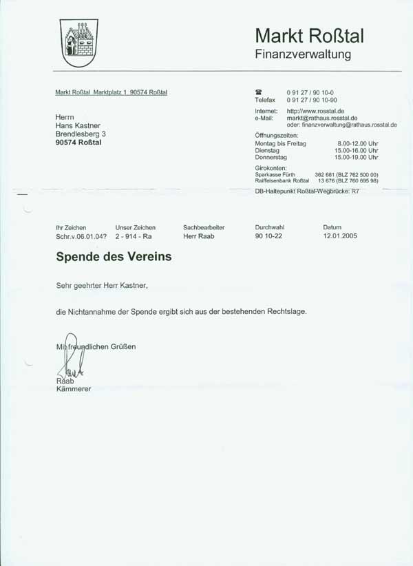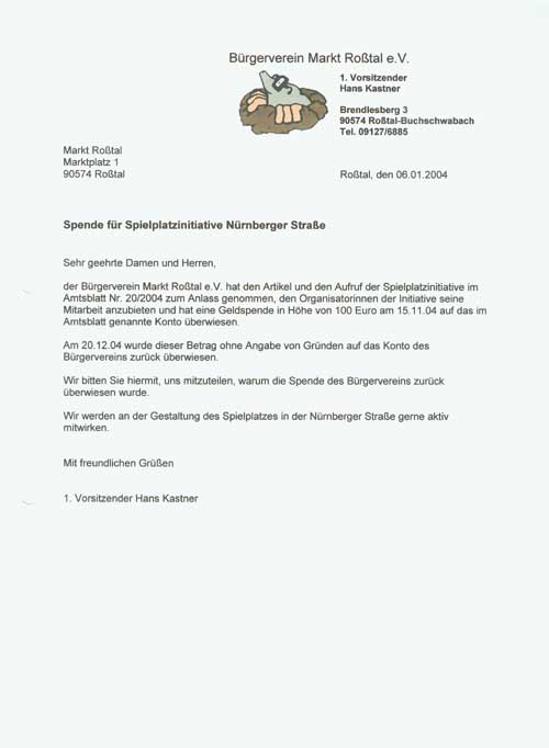 Ergebnis im Namensstreit     [09-03-2005] Der vor dem Landgericht Nürnberg-Fürth geschlossene Vergleich (siehe unten) ist jetzt rechtskräftig. Der Bürgerverein wird daher seinen Namen in "Bürgerverein im Markt Roßtal e.V." ändern. Der Markt Roßtal trägt sämtliche Kosten des Rechtsstreites. Ein paar Worte zur Roßtaler Spendenaffäre     [23-02-2005] Der Bürgerverein Markt Roßtal e.V. ist als eingetragener gemeinnütziger Verein ein Verein wie jeder andere auch. Die Kassiererin ist den Mitgliedern des Vereines über ihre Verwaltung des Vereinsvermögens zur Rechenschaft verpflichtet. Die Anforderung einer Bescheinigung über die Spende an die Spielplatzinitiative Nürnberger Straße sollte dem Nachweis dienen, dass der auf ein Konto des Marktes Roßtal überwiesene Betrag tatsächlich der Spielplatzinitiative zugute kam, die ja selbst kein eigenes Konto führen kann. Der Vorwurf der Gemeinde, dass die Spendenbescheinigung nur angefordert wurde, um die Position der Gemeinde vor Gericht zu schwächen, wenn sie auf der Bescheinigung den korrekten Namen des Bürgervereins angibt, ist sachlich nicht haltbar. Denn solange der Name eines Vereines im Vereinsregister eingetragen ist, solange ist dieser Name rechtmäßig, und aus der korrekten Verwendung dieses Namens kann niemandem ein Nachteil erwachsen. Wenn jemand der Auffassung ist, dass der Name eines Vereines nicht rechtmäßig ist, dann muss er den Weg beschreiten, den die Gemeinde tatsächlich auch gegangen ist, nämlich vor Gericht zu gehen. Dass das Gericht der Auffassung der Gemeinde nicht zu folgen vermochte, steht auf einem anderen Blatt... Unsere Spende an die Spielplatzinitiative erfolgte ohne jeglichen Hintergedanken, sondern ganz einfach aus dem Grund, weil es unserem Selbstverständnis als Bürgerverein entspricht, bürgerschaftliches Engagement zu unterstützen. Aus diesem Grund wird der Bürgerverein die Spielplatzinitiative nicht nur finanziell unterstützen, sondern hat auch zugesagt, bei den Arbeiten zur Umgestaltung des Spielplatzes mit Rat und aktiver Tat zur Seite zu stehen. Am Mittwoch, den 09.02.2005 konnte man in den Fürther Nachrichten folgenden Artikel lesen: