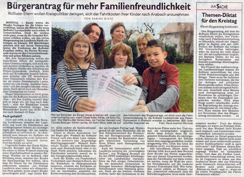 Bürgerantrag für Schüler-Gleichbehandlung     [12-12-2007] Nach erfolgreicher Unterschriftensammlung (1% der Landkreisbevölkerung musste unterschreiben, das sind 1200 Unterschriften), ist nun der Kreistag gefordert. Nur wenn aus seinen Reihen ein entsprechender Antrag gestellt wird, beschäftigt sich der Kreistag inhaltlich mit dem Bürgerantrag. Dieser soll den Kreistag dazu bewegen, sich noch einmal mit dem Thema zu befassen, dass Roßtaler Schüler, die das Platen-Gymnasium in Ansbach besuchen, abhängig von den gewählten Fremdsprachen sehr unterschiedlich die Fahrtkosten erstattet bekommen. So bekommt ein Kind, welches die Sprachen Englisch/Französisch/Italienisch lernt, die Fahrtkosten erstattet. Ein Kind, das aber Englisch/Latein/Italienisch gewählt hat, bleibt auf seinen Fahrtkosten sitzen. Der Kreistag möge beschließen, dass der Landkreis die Beförderungskosten für die Schüler aus Roßtal übernimmt, welche die 6. Jahrgangsstufe des Platen-Gymnasiums in Ansbach besuchen und die Fremdsprachenfolge Englisch/Latein/Italienisch gewählt haben. So die Aufforderung der Eltern-Initiative. Dadurch würde die Benachteiligung gegenüber den Schülern beseitigt, für die der Landkreis die Beförderungskosten übernimmt, weil sie drei moderne Fremdsprachen lernen. Hier ein entsprechender Zeitungsartikel (Fürther Nachrichten vom 07.12.2007) zu diesem Thema: